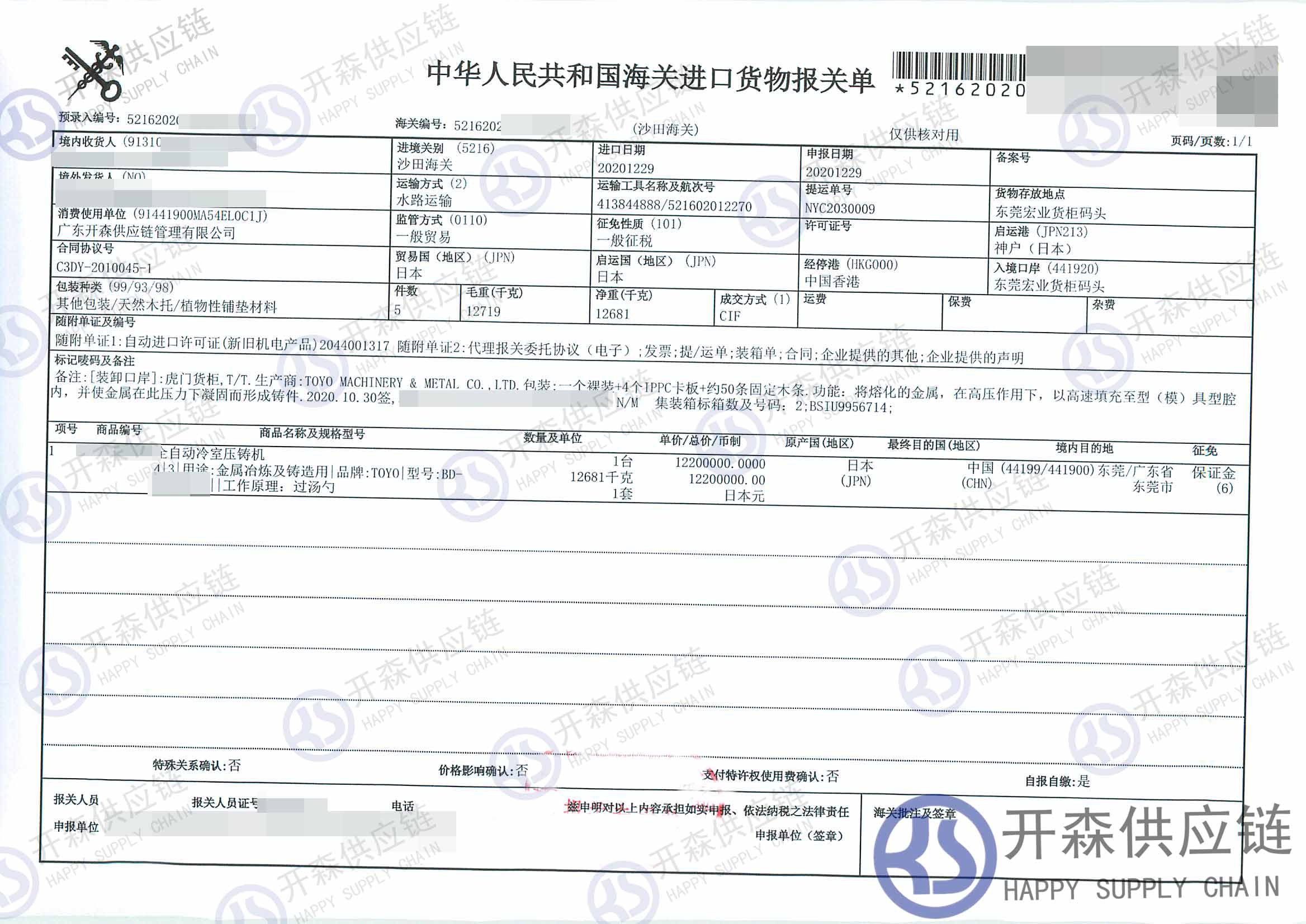 【本文结语】 上述就是【进口案例】东莞码头全自动压铸机进口报关代理服务的全部内容,希望能对您有所帮助,如有机械进口报关上任何疑问及问题可随时在线联系我们或拨打 18002611553,九游娱乐app官方入口供应链拥有丰富的机械进口报关操作经验及案例,10余年进口经验为您所用,各类进口疑难都能为您一一解答及协助快速处理解决!
