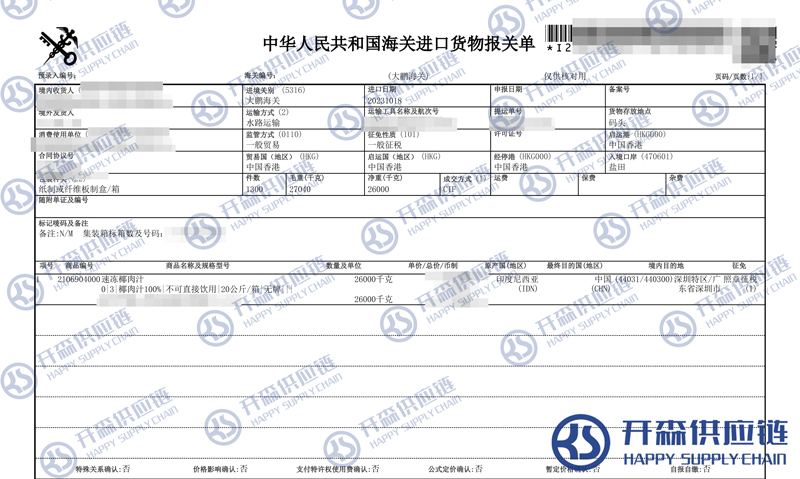 【本文结语】 上述就是深圳盐田港椰子水进口报关代理服务【清关案例】的全部内容,希望能对您有所帮助,如有食品进口报关上任何疑问及问题可随时在线联系我们或拨打 18002611553,九游娱乐app官方入口供应链拥有丰富的食品进口报关操作经验及案例,10余年进口经验为您所用,各类进口疑难都能为您一一解答及协助快速处理解决!