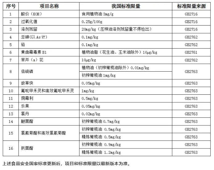 进口食用橄榄油食品安全卫生指标应该符合现行的GB2716《食品安全国家标准植物油》、GB2761《食品安全国家标准食品中真菌毒素限量》、GB2762《食品安全国家标准食品中污染物限量》和GB2763《食品安全国家标准食品中农药最大残留限量》等,现将部分相关卫生指标和强制指标梳理如下: